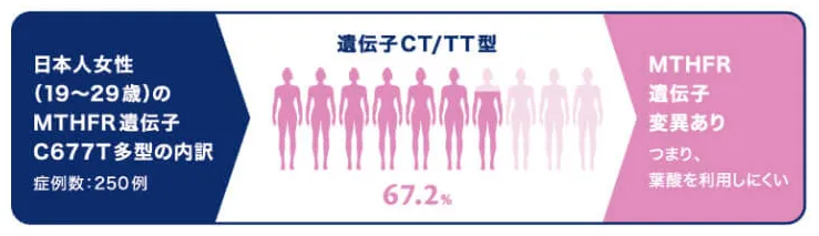 日本人女性の67.2%は、葉酸の代謝に必要な酵素(MTHFR)が働かず、摂取した葉酸を利用しにくい体質です。