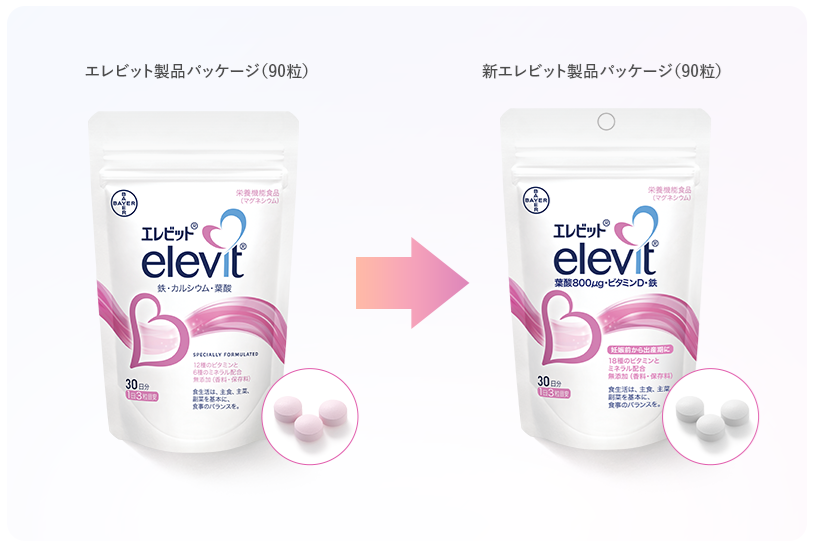 新しいエレビットでは、妊活・妊娠中の方に必要な栄養素として、ビタミンDの量が3倍*の25㎍に増え、白色の粒に変更になります。